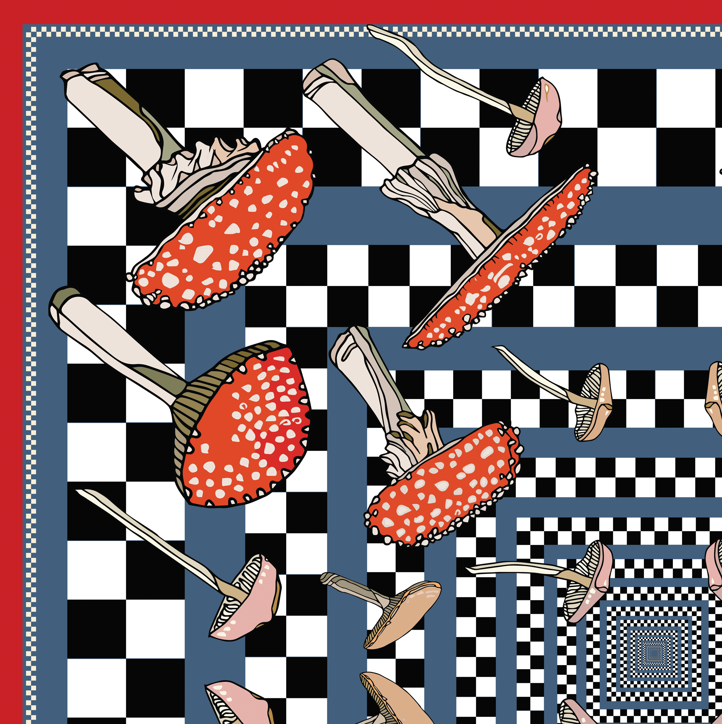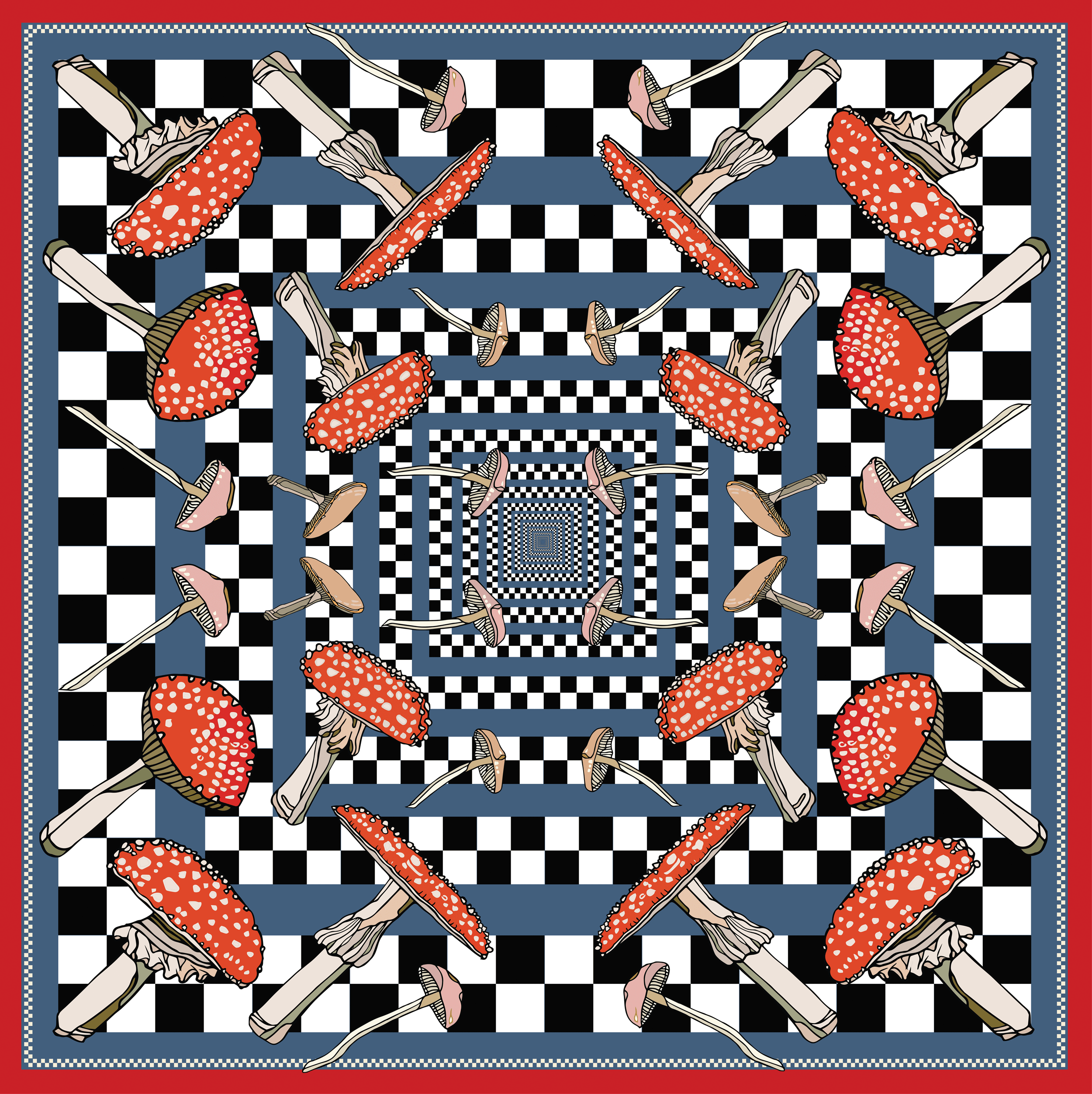 Mushroom Chequerboard Blue Silk Handkerchief 45x45cm