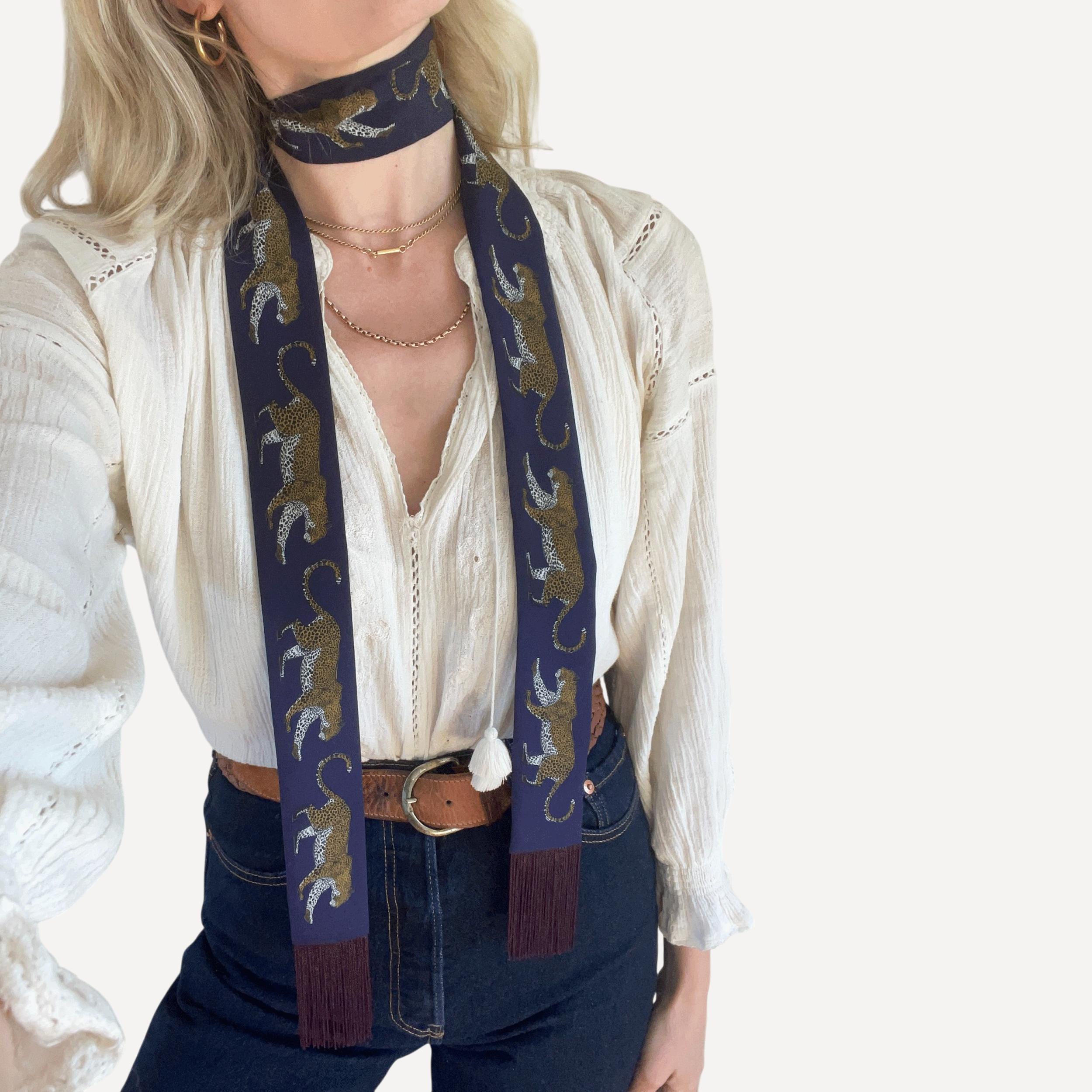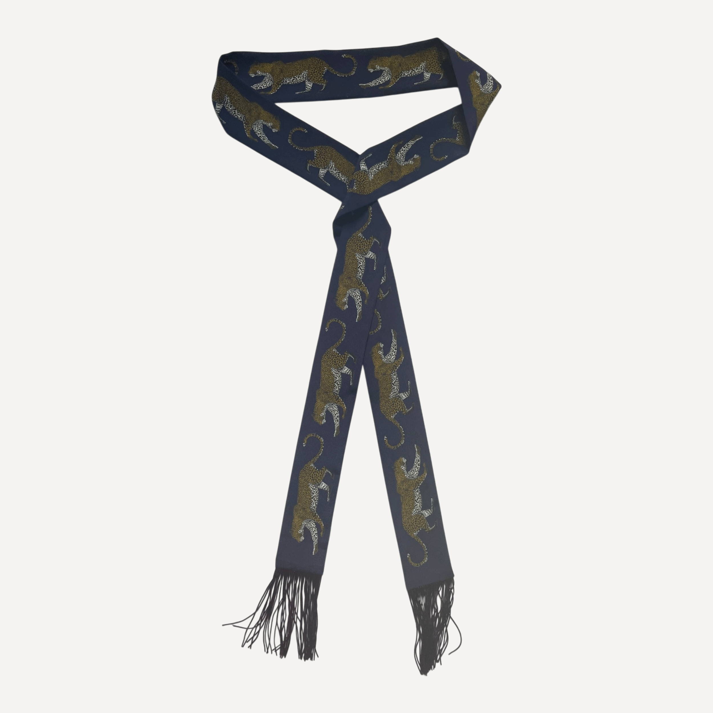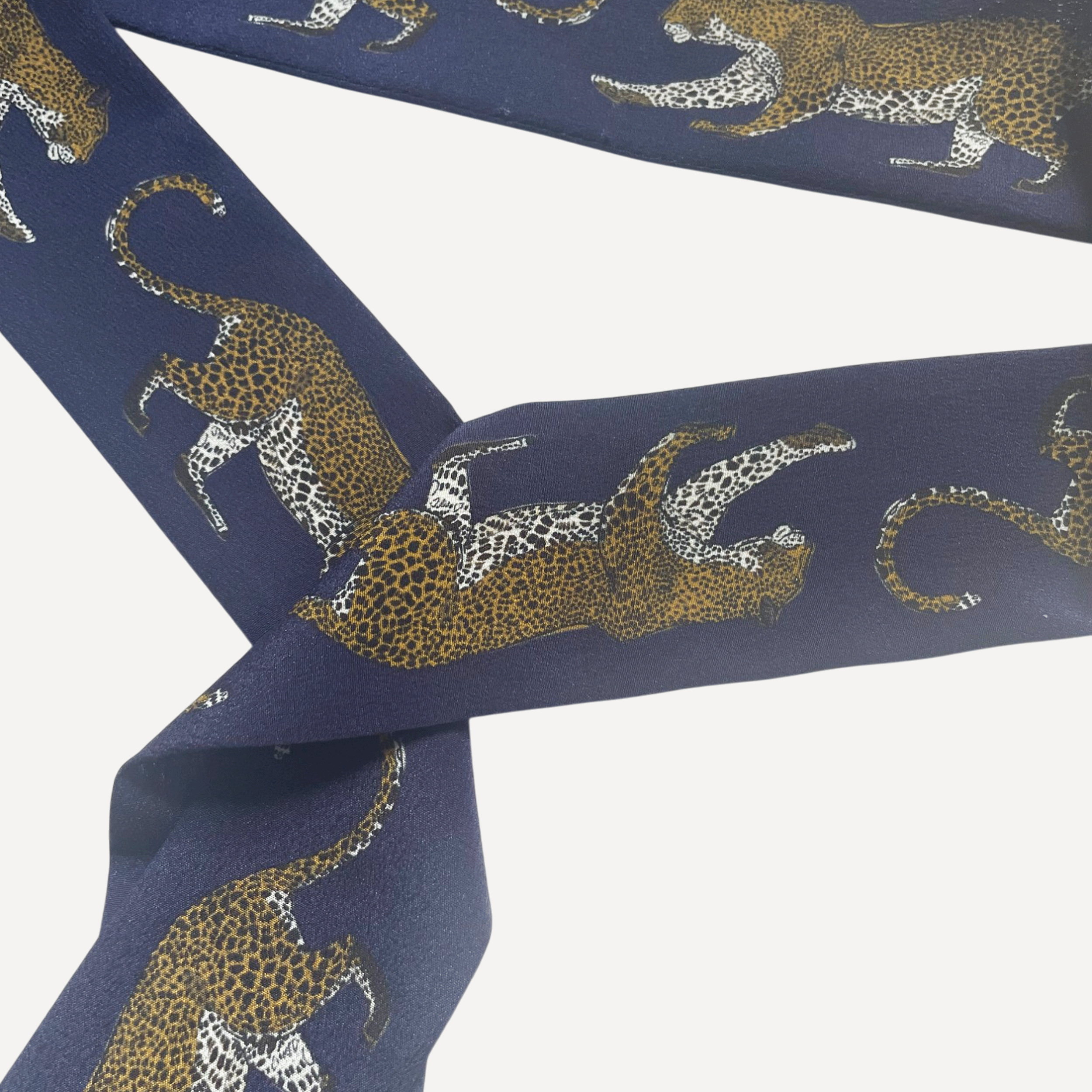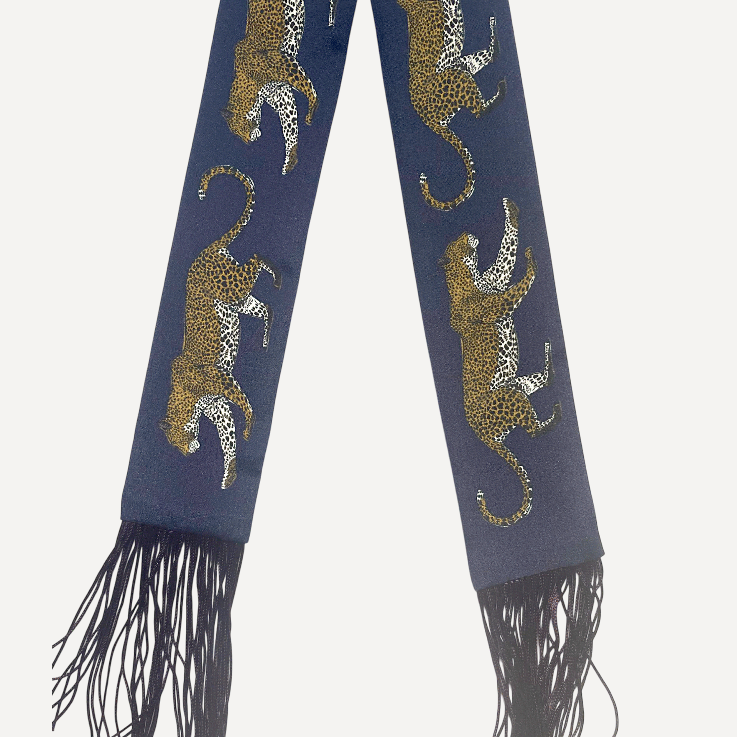 Our Leopard Super Skinny scarf in Purple packs a bold punch in a slender silhouette. Hand-drawn leopard motifs in rich tones bring a confident, playful energy to a sleek silk crepe de chine ribbon, with premium fringed edges, They are perfect for knotting around the neck, tying into hair, or looping onto a bag for a stylish accent. A tiny piece of luxury with maximum impact.