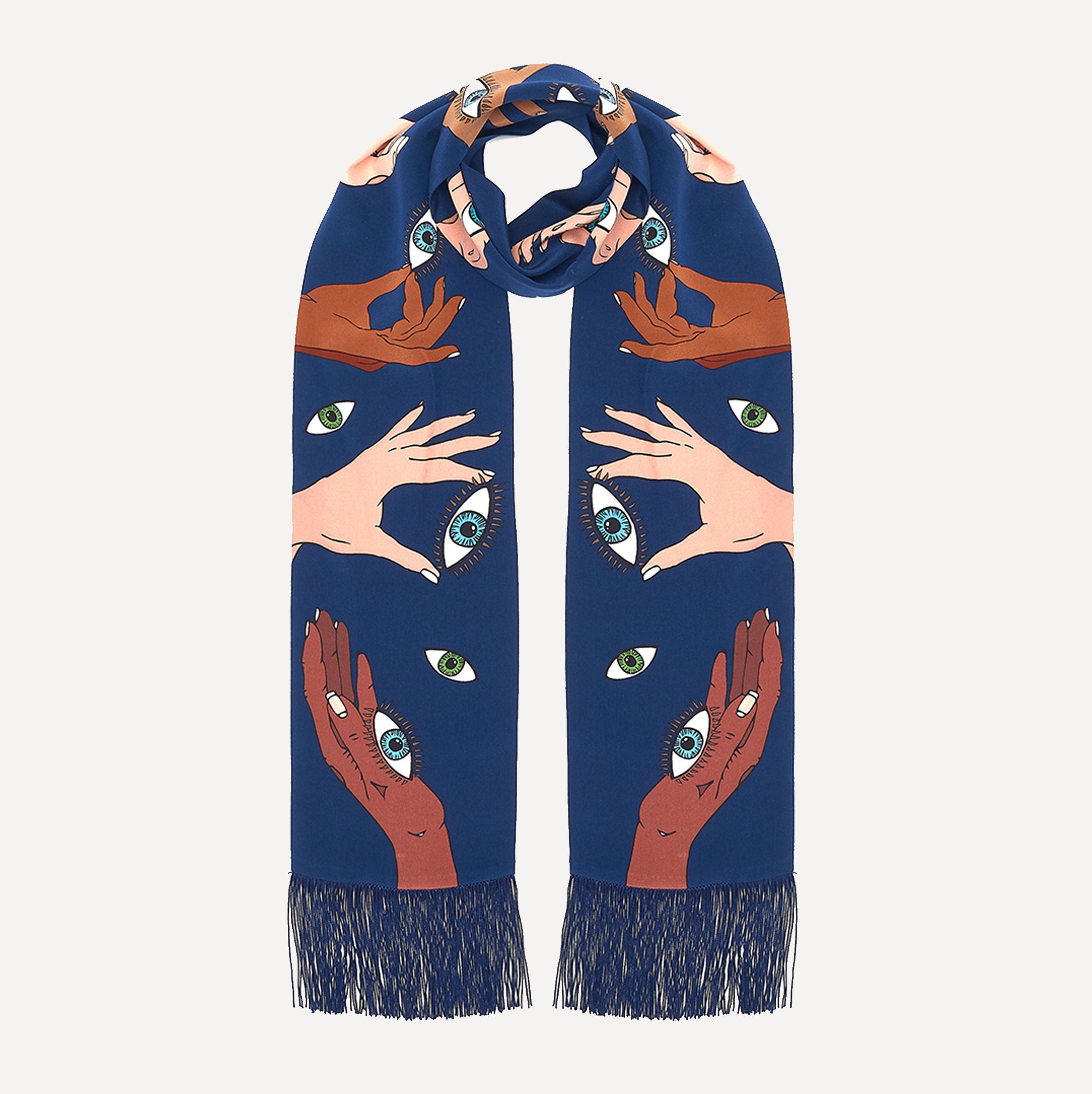 Skinny silk scarf ‘ hands and eyes ‘ in navy with navy fringing