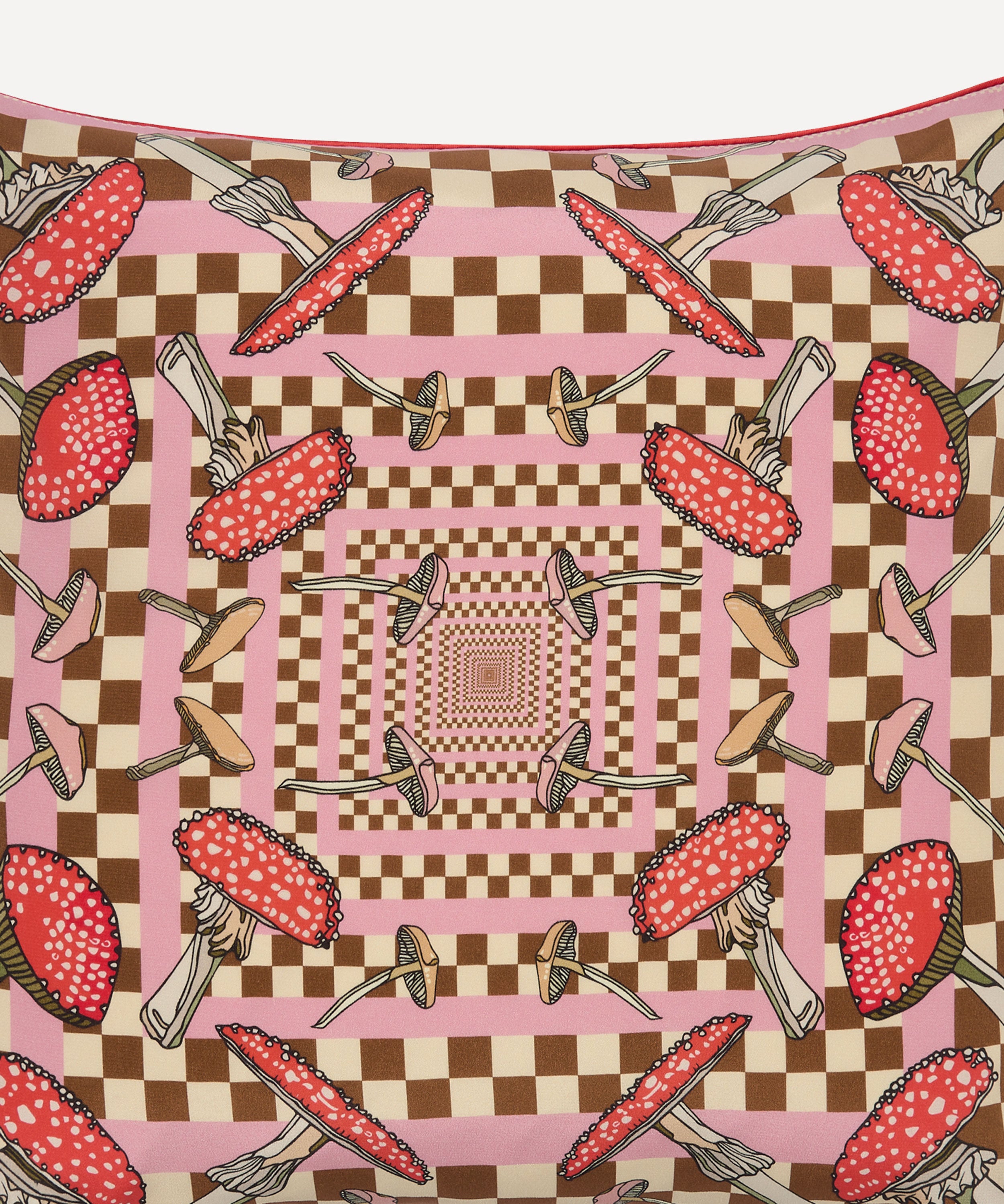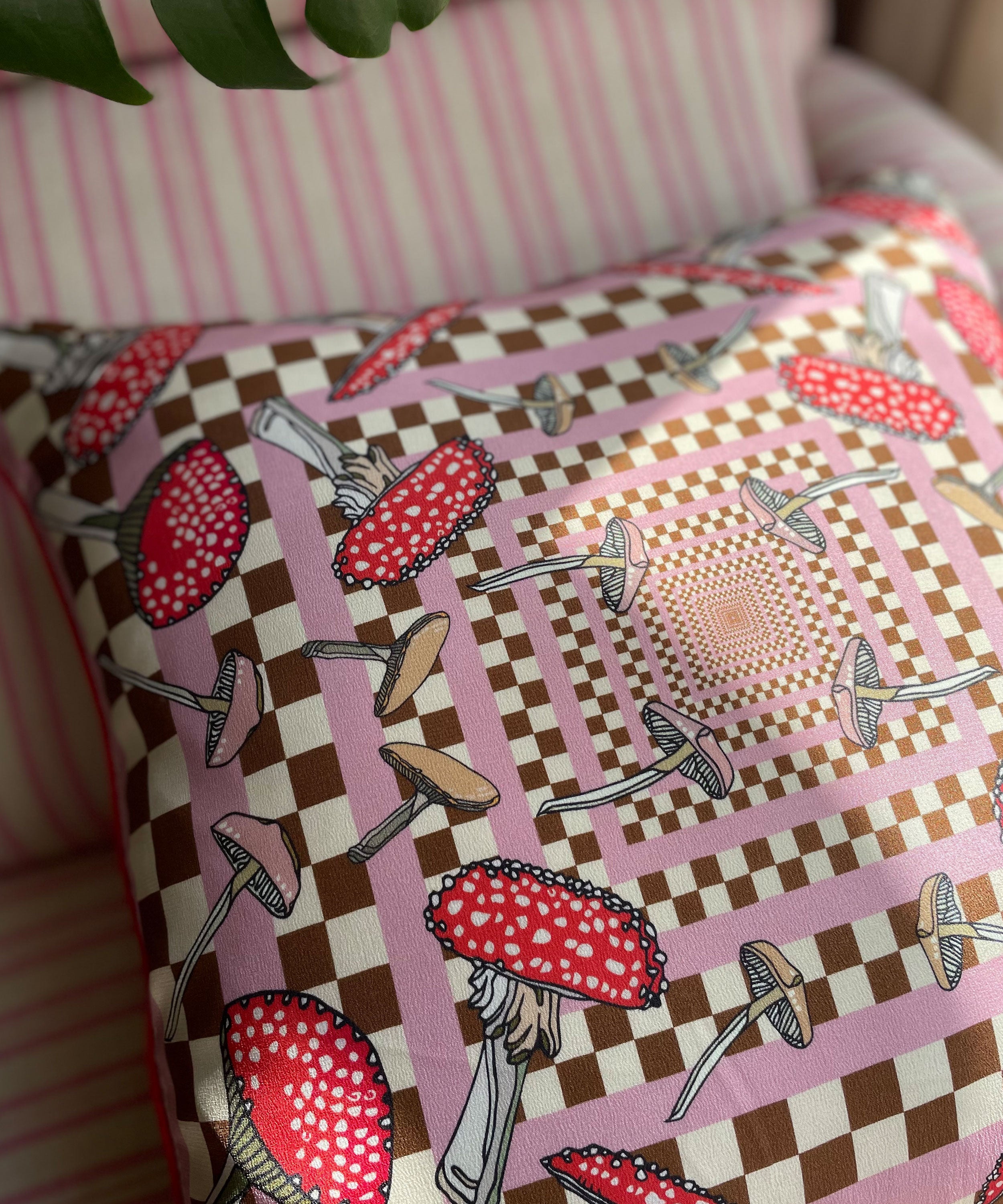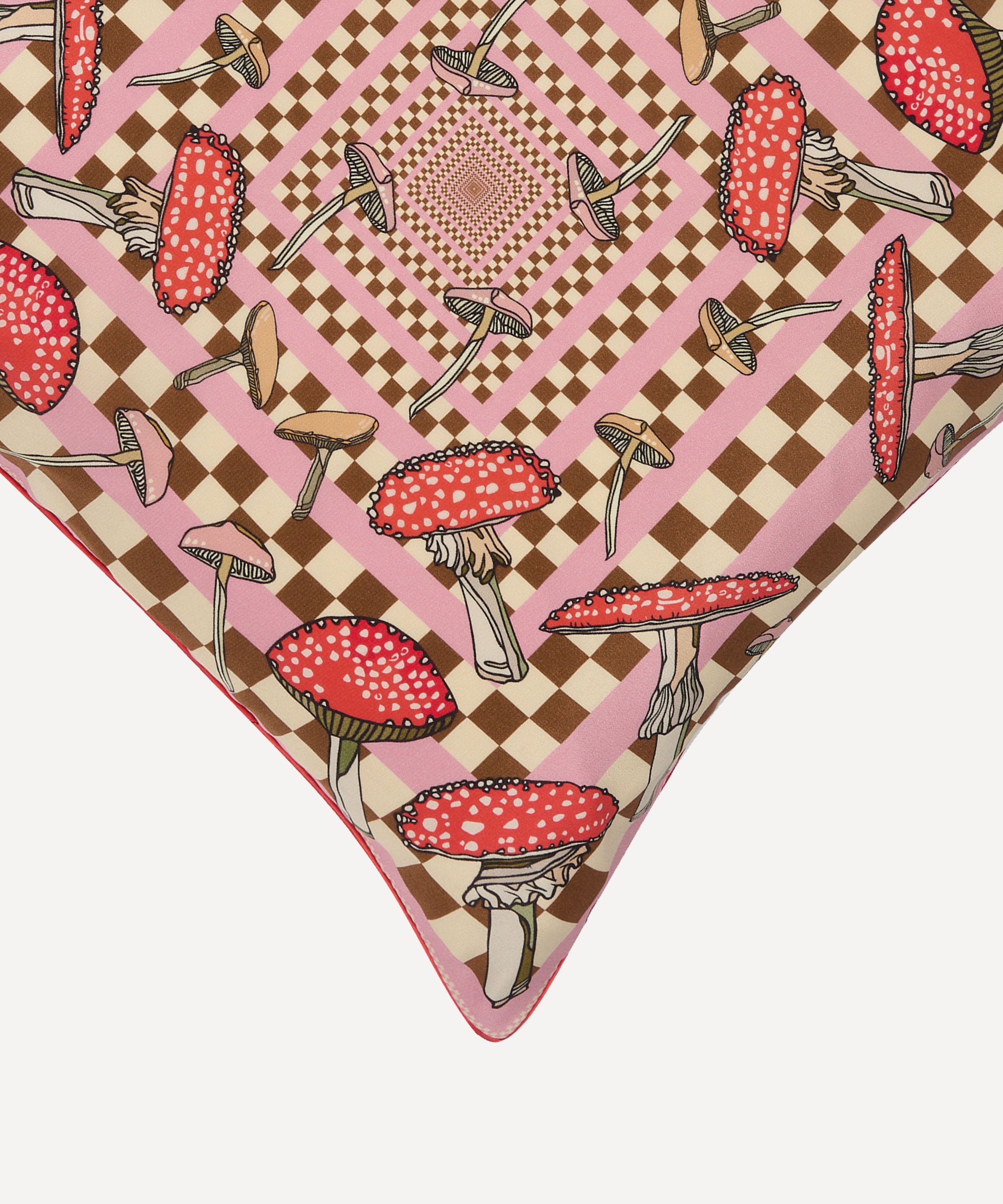 Mushroom Chequerboard Pink Silk Cushion - Pre Order