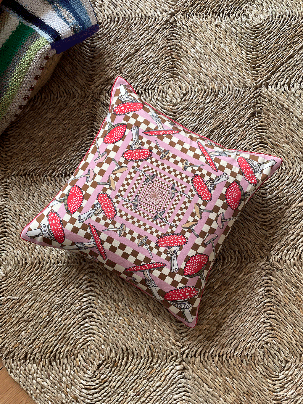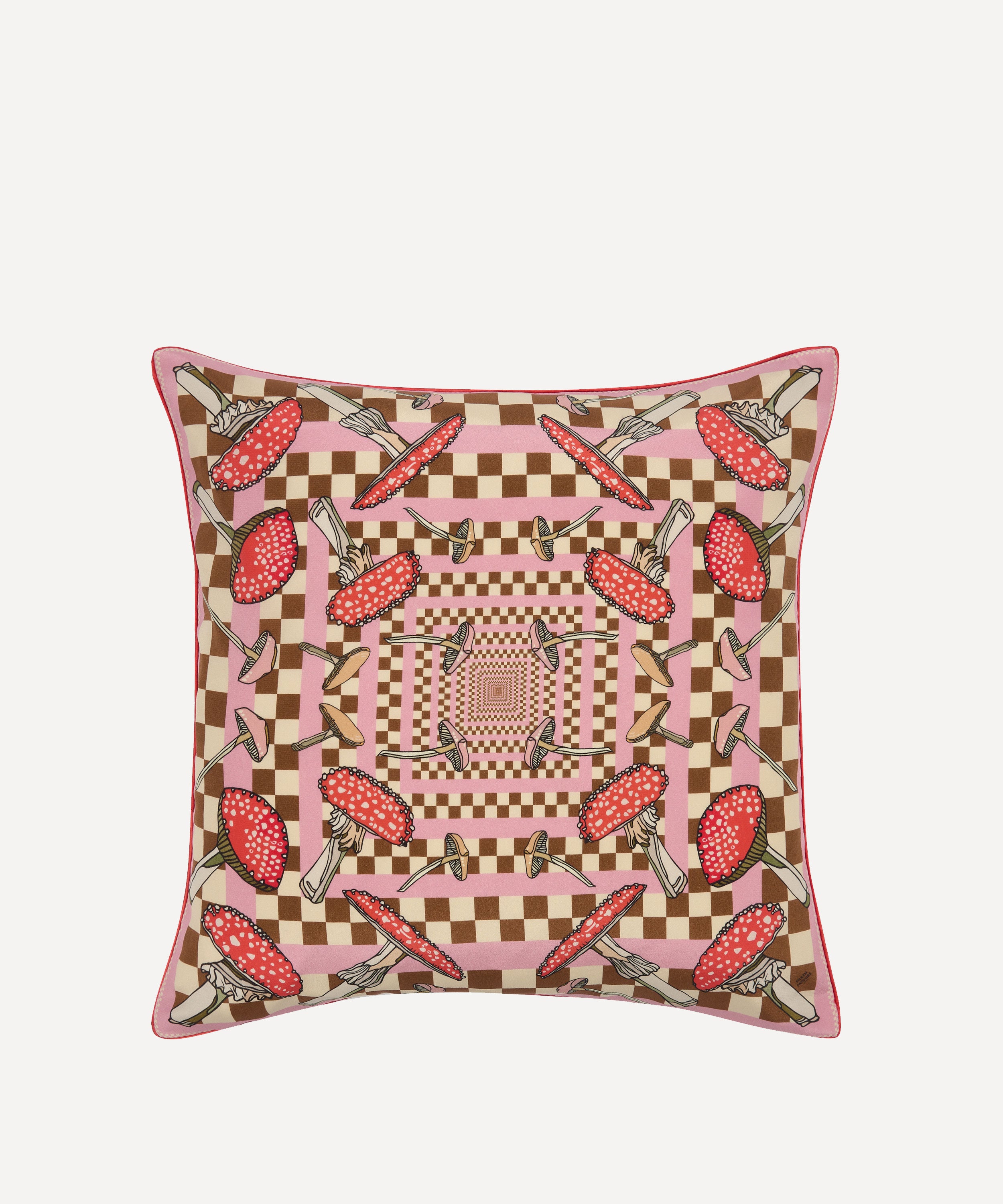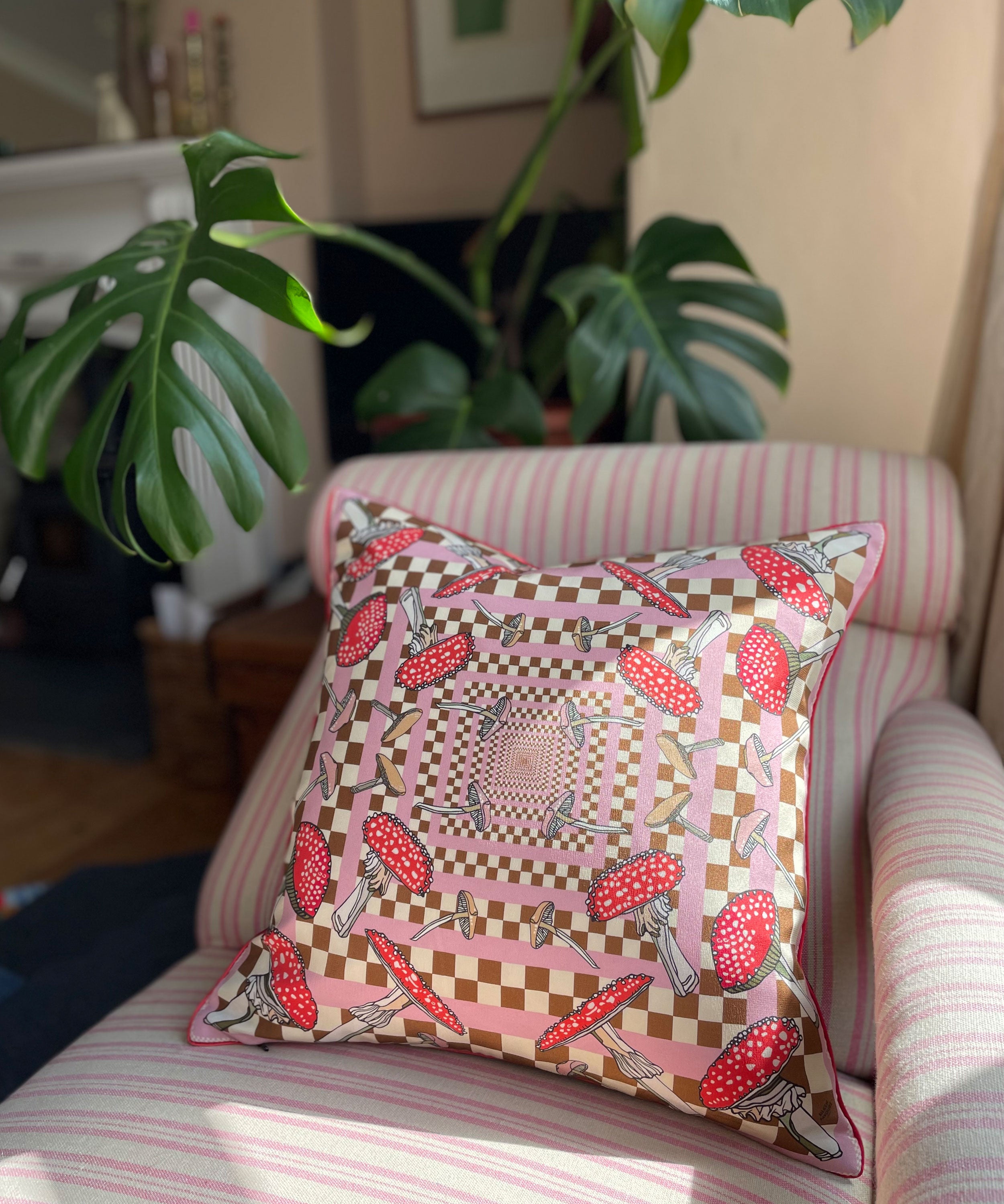 Mushroom Chequerboard Pink Silk Cushion - Pre Order