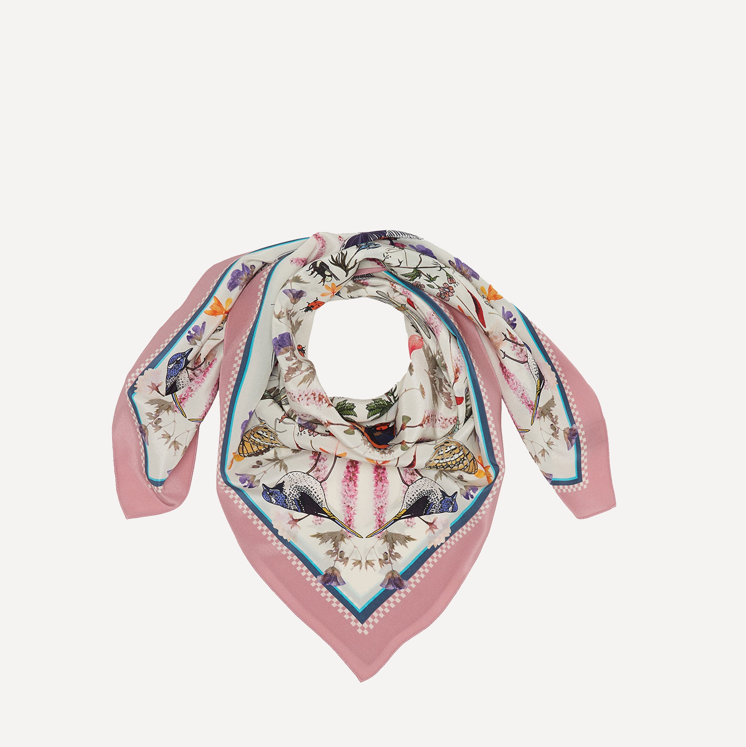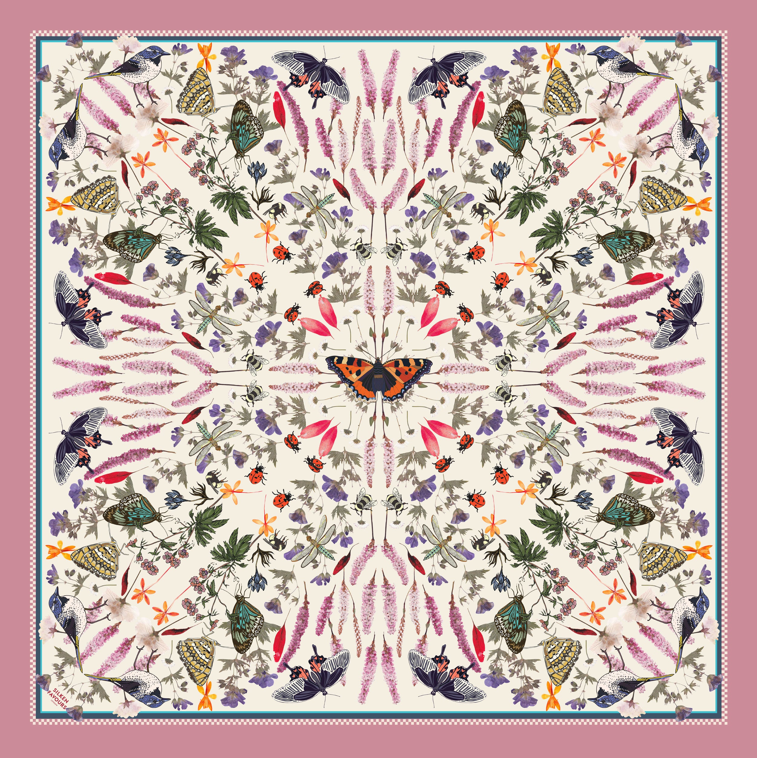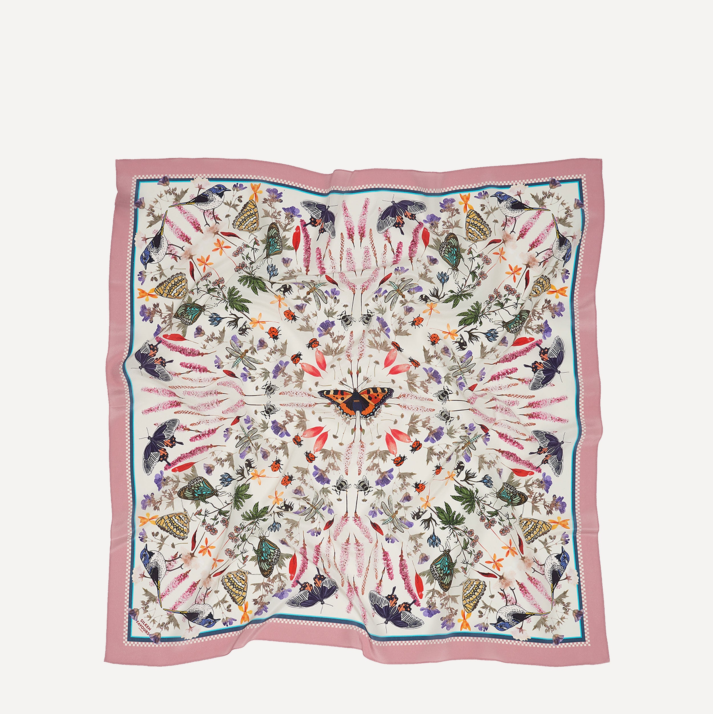 A whimsical garden in full bloom, this dreamy silk scarf combines hand-pressed blossom flowers with Vicki Murdoch’s signature illustrations of butterflies and birds. Set against a soft cream backdrop and pretty pink border, Silken Bloomers feels both fresh and nostalgic like a page from a secret botanical journal.