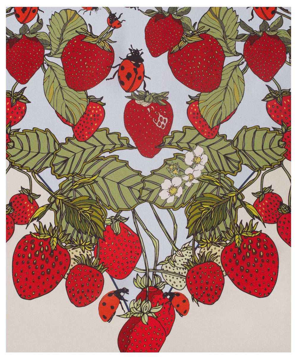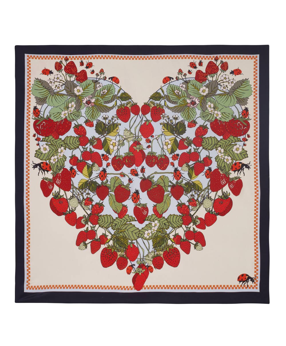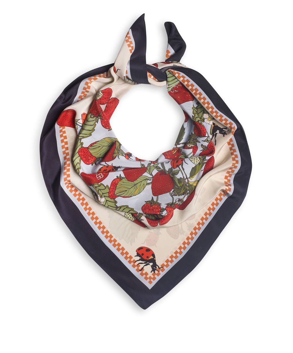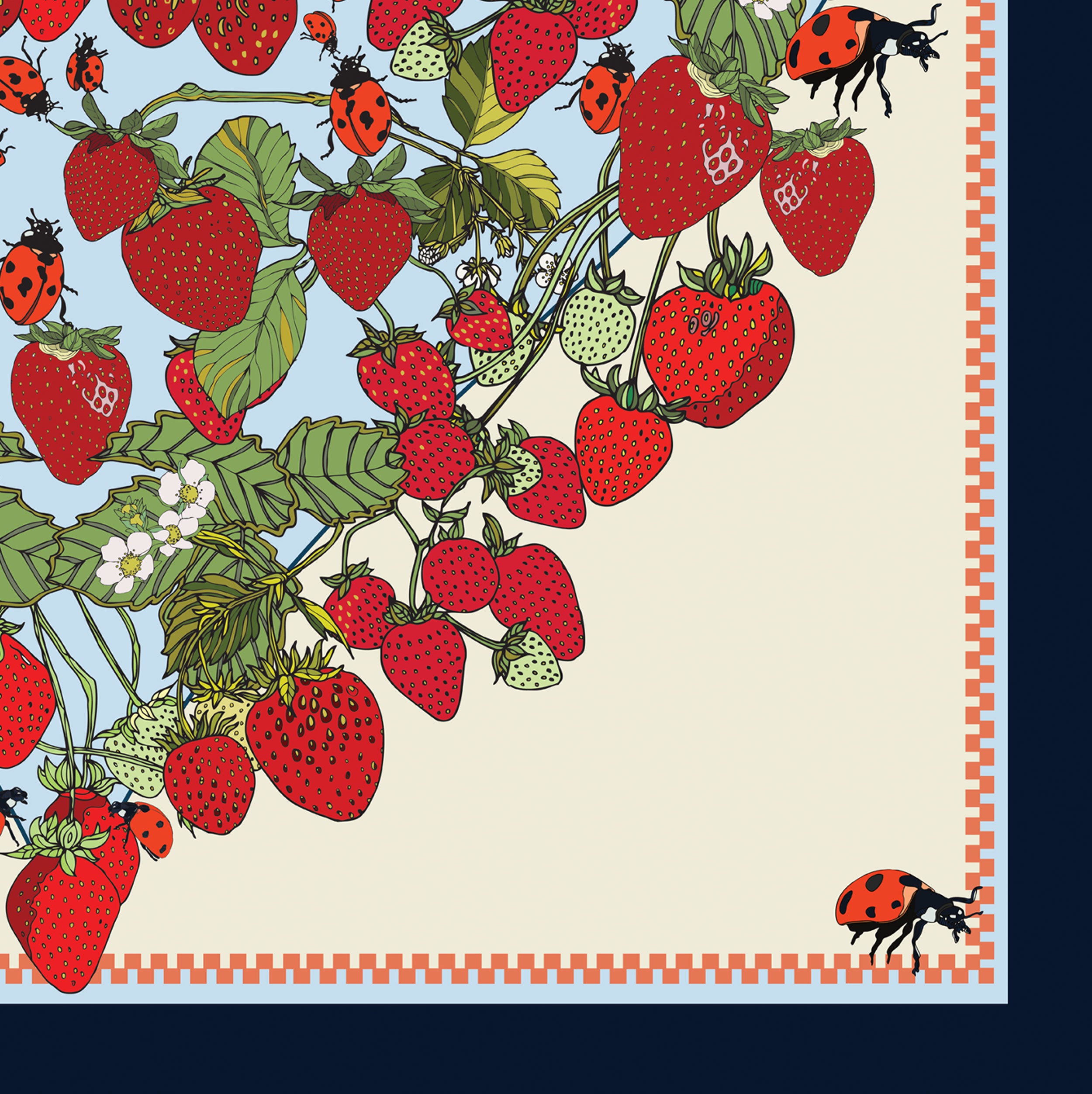 Infuse ensembles with a cheerful summer feeling in this lively silk scarf. Printed with with illustrated strawberries and ladybirds on a very light blue heart with cream background and dark navy border. Drape it or tie it around the neck over a simple tee or a relaxed silk shirt for a feminine take on alternative styling.